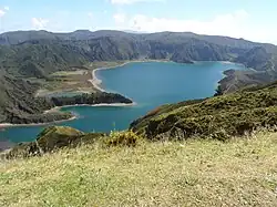The outer caldera dates from between 30,000 and 45,000 years ago, and comprises an area 4 kilometres (2.5 mi) wide and 13 kilometres (8.1 mi) long outer caldera (corresponding to the Água de Pau Massif).[2] The inner caldera, which is 2.5 kilometres (1.6 mi) wide and 3 kilometres (1.9 mi) long was formed about 15,000 years ago. It is the younger inner caldera that is partially filled by the crater lake Lagoa do Fogo.[1]