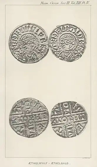 No coins are known to have been issued in the name of Æthelbald. The main mints in southern England were both in Kent, at Canterbury and Rochester. They minted coins in the name of Æthelwulf until 858 and then in the name of Æthelberht. There was one mint in Wessex, probably at Southampton or Winchester, but it operated at a minimal level in the mid-ninth century and only three coins from it between 839 and 871 are known, two of Æthelwulf and one of Æthelred I, all produced by the same moneyer. The fact that the Kentish mints produced coins only for Æthelberht between 858 and 860 is evidence that Æthelbald was not his brother's overlord.[40] Three coins of Æthelbald were regarded as genuine in the late nineteenth century, but in the 1900s they were found to be forgeries.[41]
