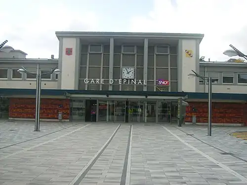 Épinal station (French: Gare d'Épinal) is a railway station serving the commune of Épinal, Vosges department, France. The station is owned and operated by SNCF, in the TER Grand Est regional rail network and is served by TGV and TER trains.[1] In 2018 the station saw 1,013,669 passengers.[2]