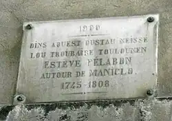 Plate that says in occitan : "In this house the troubadour Etienne Pélabon, Maniclo's author, was born"