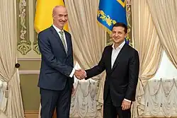 ![]() de Poncins with the President of Ukraine, Volodymyr Zelenskyy | |