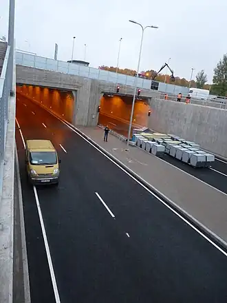 The Ülemiste Tunnel is a road tunnel in Tallinn, Estonia.[1] It is located southeast of the city centre near the Lake Ülemiste. The tunnel connects Peterburi road (Tallinn–Narva Road, part of E20) with Järvevana road (part of the inner beltway). It opened on 9 October 2013. The tunnel is 320 m (1,050 ft) long and consists of two parts divided by a thick concrete wall. It is the only road tunnel of its kind in Estonia.