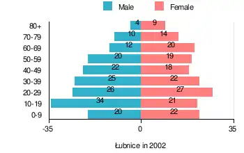 According to the 2002 Poland census, there were 345 people residing in Łubnice village, of whom 50.1% were male and 49.9% were female. In the village, the population was spread out, with 25.8% under the age of 18, 35.4% from 18 to 44, 20% from 45 to 64, and 18.8% who were 65 years of age or older.[1]