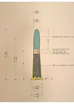 Work on the cartridge did not progress quickly and it took until 1885 for further designs to be produced. The only major change was to change the cartridge from a tapered case to a parallel-sided bottlenecked case in drawing RL 5072, as this was easier to produce, even though it required the rechambering of all the arms using it.[2] A mass-produced trials rifle, the Pattern A, was produced for the bottle-necked cartridge.