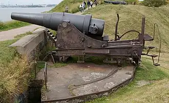 In the coastal defense role, the M1877 was mounted on a garrison mount which sat on a concrete slab behind a parapet. The mount consisted of a rectangular steel firing platform with a pivot at the front and two wheels at the front and rear to give 120° of traverse. The recoil system for the M1877 consisted of a U-shaped gun cradle which held the trunnioned barrel and a slightly inclined firing platform with a hydro-gravity recoil system. When the gun fired the hydraulic buffers under the rear slowed the recoil of the cradle which slid up a set of inclined rails on the firing platform and then returned the gun to position by the combined action of the buffers and gravity. Due to its limited angle of elevation 20°, the M1877 was a low-angle direct fire weapon instead of a high-angle indirect-fire coastal defense mortar like many of its contemporaries.[2]