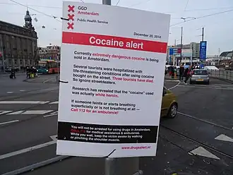 A "cocaine alert" sign posted by GGD Amsterdam: the sign reminds people to "Call 112 for an ambulance."