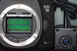 A 35 mm format "full frame" digital image sensor (left, in green) is revealed inside the mirror box of a Canon DSLR camera.