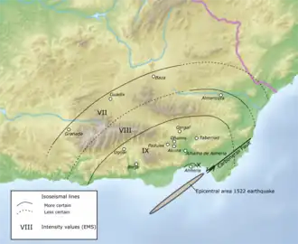 The 1522 Almería earthquake (Spanish: Terremoto de Almería de 1522) was a major seismic event estimated to be 6.8–7.0 Mw that occurred on 22 September. The epicenter was in the capital of Almeria in the Andarax Valley, near Alhama de Almería. It had a maximum felt intensity of X–XI (Extreme) on the European Macroseismic Scale (EMS), and killed about 2,500 people, making it among the most destructive seismic events in Spanish history.