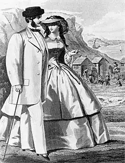 1859 fashion plate of both men's and women's daywear, with seabathing in background. He wears the new leisure fashion, the sack coat.