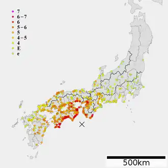 Much of southwestern Honshu, Shikoku and Kyūshū experienced shaking of 5 or more on the JMA scale, with most of Shikoku and nearby coastal areas of Kansai suffering an intensity of 6.[9]