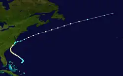 A tropical storm was first observed east of the Bahamas on September 6. It moved slowly northwestward towards the coast of the United States and attained hurricane strength early on September 9. The cyclone continued travelling northwest along the US coast, becoming a Category 2 hurricane whilst off the coast of Georgia on September 11. On September 13 the cyclone made landfall near Wilmington, North Carolina, but then quickly weakened to a tropical storm and turned eastward into the Atlantic on September 14. Throughout September 15, whilst over water, the storm regained hurricane strength and continued northward before becoming extratropical in the mid-Atlantic on September 17.[7]