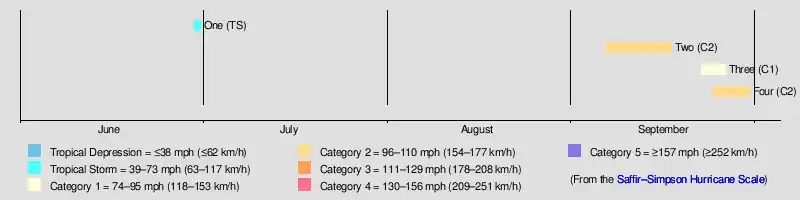 Four September 24–30 Category 2 hurricane 105 (165) Unknown Leeward Islands, Yucatán Peninsula, Mexico, & Texas Unknown None