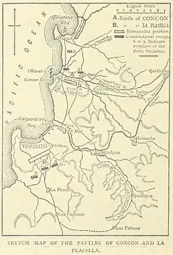 In the middle of August 1891 the rebel forces were embarked at Iquique, numbering in all about 9,000 men, and sailed for the south. The expedition by sea was admirably managed, and on 10 August the Congressional army was disembarked at Quintero, about 20 km. north of Valparaiso and not many miles out of range of its batteries, and marched to Concón, where the Balmacedists were entrenched.