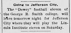 5. ^ "Lincoln Institute vs. Sedalia". The Daily Tribune. Jefferson City, Missouri. December 3, 1898. p. 3. Retrieved October 11, 2024 – via Newspapers.com Open access icon.