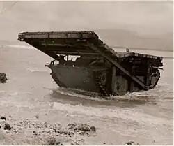 On Tinian there were two small beaches on the North end where an assault landing could be made with low coral ledges.[5] The rest of the island had coral cliffs up to 15 feet in height at the waters edge negating any assault plans. However, the Marine Corps asked the Seabees if they could come up with an idea to get over the coral. Commodore Paul J. Halloran (CEC) CB theater commander provided drawings of a conceptual landing ramp for the 18th and 121st CBs to fabricate.[5] They mounted steel beams salvaged from Saipan's abandoned sugar mill on LVT-2s to create a portable assault ramps. If they worked they would allow the Marines to outflank Tinian's prepared defenses. The Marine Generals was skeptical and ordered that the ramps be put through a 100 vehicle use tests. The Seabee creation was named a Doodlebug.[5] It worked exactly as the Marines had hoped.[5]