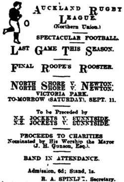 A trophy which is still played for today saw its beginnings in the 1915 season. Namely the Roope Rooster trophy which was donated by Mr. Pauntley Whittington (Dick) Roope. It was a knockout competition with one round of matches before semi-finals were played.[7] Roope had retired from playing (for Ponsonby) and was the Auckland Rugby League chairman to start the season. However he resigned his position in order to be able to resume playing for the young Grafton Athletic club. With the semi-final between Newton and Grafton being drawn (after North Shore received the bye) the management committee decided rather than replaying a match between the same teams there would be more interest in a match between Grafton and North Shore, with Newton progressing to the final. The second semi-final was played at Victoria Park and saw both teams wearing white armbands in memory of 3 men killed in action at the Dardanelles who had played club rugby league in Auckland (Charles Savory from Ponsonby United, Charles James Hally from Otahuhu, and William Moeki from City Rovers).[8] A charge was made for the semi-final between North Shore and Grafton with the proceeds going to the Door of Hope, the Salvation Army Maternity and Rescue Homes, Sister Esther's Relief Work, and the St John Ambulance Brigade. The final was played on 11 September at Victoria Park between North Shore Albions and Newton Rangers, with North Shore winning 10 points to 7.[9]