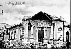 In the towns of Armenia and Quezaltepeque, 40 people were killed and over 100 were injured. Damage in San Salvador was severe; described as "80 out of every 100 homes" levelled. The business district of San Salvador was incinerated by fires.[8] Out of the 9,000 homes in San Salvador, only 200 remained standing. All government buildings with the exception of the national theater and palace withstood the earthquake. Hospitals, university buildings, schools, and other public buildings were razed. The National Palace, National Press building, President Residence and banks were also devastated.[6][7] Surviving buildings eventually toppled during the second major earthquake at 19:30.[9] In addition to damaged buildings, the local coffee plantations were ruined.[10] The earthquake was experienced by Colombian poet, Porfirio Barba-Jacob, who documented it in a book and the local newspaper Diario del Salvador.[11][6]