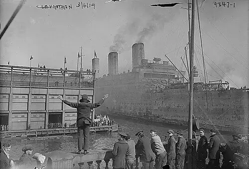 The Leviathan ship pulls into NY Harbor on March 6, 1919. Dockworkers returning from strike to ensure it and Mauretania’s safe arrival of the men of the 27th.