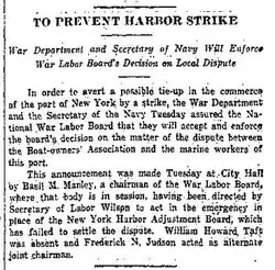 11. ^ "MORE FOR PORT WORKERS.; Arbitration Board, Unionists and Employers, Announces Agreement" (PDF). The New York Times. June 17, 1919. ISSN 0362-4331. Archived from the original on May 30, 2023. Retrieved March 6, 2023.