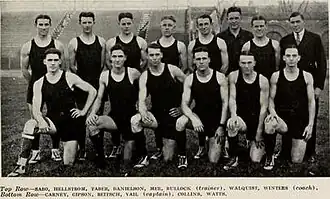 The 1920–21 season began a new era for the Illinois Fighting Illini men's basketball team. New head coach Frank Winters was coming to the University of Illinois after five successful years as head coach of Rockford Central High School in Rockford, Illinois. During his tenure in Rockford, he guided his Rabs teams to three round of 16 finishes, one quarterfinals finish and one team finished its season as state champions. Winters inherited a team whose best player, Chuck Carney, severely injured his knee in the last football game. The team went on to an overall record of 11–7.[1] The Big Ten record for the Illini, at the conclusion of the 1920–21 season was seven wins five losses and a tie for fourth place. The starting lineup included All-American Chuck Carney, Laurie Walquist and Norton Hellstrom at forward, Henry Reitsch at center, and Charles Vail, John Sabo and Walter Collins as guards.[2]