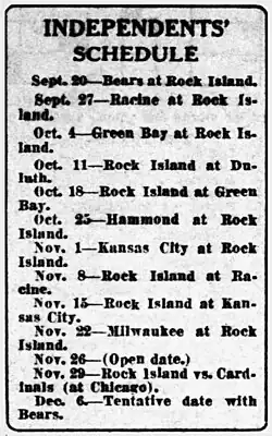 4. ^ a b "Cardinals Object to Islander–Bears Game: Claim Prior Appearance of Independents in City Would Hurt Their Game on Nov. 27," Rock Island Argus, Oct. 13, 1925, p. 12.