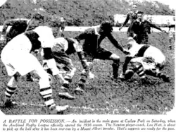 On April 18 a special round of matches were played to open the season. The proceeds were divided between the clubs and a benefit fund for Jim Laird, the Marist international player who was injured in a New Zealand match late in the 1935 season. In the match between Richmond and Mount Albert, a Richmond forward was ordered off (though the newspapers did not state who the player was) and was suspended for four weeks.[35] There were four matches played at Carlaw Park. The Manukau senior side had yet to be admitted at this point and so Devonport played the Pukemiro team from the South Auckland league. The same weekend Papakura defeated Point Chevalier in a pre-season match at Papakura by 38 points to 5.[36] Former rugby representative player, Reginald Haslam was on debut for Marist after switching codes. He would represent Auckland in a match later in the season.