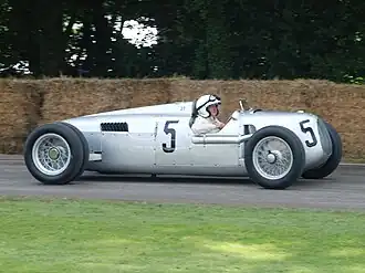 Auto Union had its new Type C, who had successfully been able to fit a remarkable supercharged 6.0-litre V16 that put out 520 bhp and still staying under the 750 kg weight limit. Four inches longer, with a limited-slip differential and torsion-bar suspension now installed, the handling was greatly improved.[1][41][20][42][43]