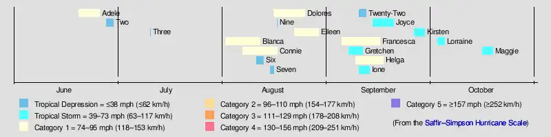 Had any tropical storms formed in the North Pacific between 140°W and the International Date Line in 1966, their names would have been drawn from the Western Pacific typhoon naming list.[17] Named storms in the table above that crossed into the area during the year are noted (*).[18]