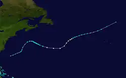 A subtropical depression developed at 12:00 UTC on September 14, while located about 295 mi (475 km) southeast of Cape Hatteras, North Carolina, initially moving east-northeastward. Early on September 16, it briefly curved north-northwestward and strengthened into a subtropical storm, before turning back to the east-northeast later that day. By September 17, the storm re-curved to the southeast and decelerated, before accelerating again on September 19. Strengthening continued, with the storm becoming a Category 1-equivalent subtropical cyclone early the following day. At 00:00 UTC on September 22, it peaked with maximum sustained winds of 85 mph (135 km/h) and a minimum barometric pressure of 976 mbar (28.8 inHg). Accelerating northeastward, a weakening trend soon commenced. The subtropical storm became extratropical by 12:00 UTC on September 22.[8]