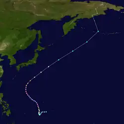 Typhoon Tess was first noted as a closed circulation on 1 September 600 nautical miles east-northeast of Saipan. The storm intensified over the next few days, becoming a typhoon on the 3rd. The cyclone reached its peak intensity on the 4th. Tess then weakened, losing typhoon status on the 8th, and dissipating over the Sea of Irkutsk on the 10th, being absorbed into a frontal system.[3]