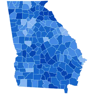 This is the only presidential election in Georgia's history where the Democratic candidate carried all of Georgia's counties, despite the state's long Democratic streak, which had ended only in 1964.[2] Even though Carter's percentage of the vote was lower than that of several previous Democratic victors in the state, such as Woodrow Wilson, James M. Cox, John W. Davis, and Franklin D. Roosevelt, none of these had carried every county in the state. In particular, Carter remains the only Democrat to carry historically pro-Union, East Tennessee-oriented[3] Fannin County since 1912, and the only Democrat to obtain a majority of the vote there since William Jennings Bryan in 1900.[4] There are a further seven counties, in addition to Fannin, that have never voted Democratic again since 1976: Dade, Walker, Catoosa, Fayette, Columbia, Lee and Lowndes.[5] Douglas and Rockdale counties would not vote Democratic for president again until 2008, and Cobb and Gwinnett would not do so until 2016.