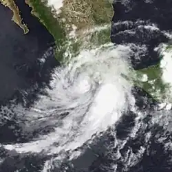 The Atlantic's Hurricane Greta struck Central America and maintained its status as a tropical cyclone while crossing into the East Pacific. It emerged into the Gulf of Tehuantepec as a tropical depression but soon gained strength over warm waters; since it entered a new basin, the depression was reclassified as Tropical Storm Olivia. The cyclone moved erratically after this point while continuing to intensify,[5] becoming a hurricane and attaining peak winds of 75 mph (121 km/h) by 00:00 UTC on September 22.[6] Olivia eventually tracked north-northeast, moving onshore about 60 mi (97 km) east of Salina Cruz between 19:00–20:00 UTC that day;[5] the system maintained winds of 60 mph (97 km/h) at that time. Rapid weakening occurred thereafter, and Olivia dissipated after 00:00 UTC on September 23.[6]