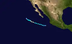 A small disturbance coincident with a tropical wave was first identified south of Acapulco on August 19.[4][5] The system moved west and coalesced into a tropical depression around 18:00 UTC on August 23.[6] The depression failed to intensify over subsequent days, and in fact, it was operationally downgraded back to a disturbance on August 26.[5] In the official database, the cyclone maintained its status and eventually intensified into Tropical Storm Miriam around 00:00 UTC on August 27.[6] Miriam turned west-southwest and entered the Central Pacific,[5] where it intensified into a hurricane at 12:00 UTC on August 28 and reached peak winds of 90 mph (140 km/h) twelve hours later.[6] Miriam then began to steadily weaken as it passed south of Hawaii,[5] and the cyclone dissipated after 00:00 UTC on September 2.[6]