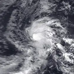 The season's second tropical cyclone began as a disturbance spawned by an African tropical wave southwest of the Mexico coastline on June 15.[4] It moved generally westward over very warm waters, and observations from satellite imagery and ships outlined the formation of a tropical depression by 00:00 UTC on June 17.[5] Six hours later, the depression intensified into Tropical Storm Bud.[6] Continued ship observations relayed Bud's intensification to a 60 mph (97 km/h) cyclone on June 18, but the storm weakened thereafter as it moved west-northwest under the influence of a ridge,[5] and it ultimately dissipated within the ITCZ after 06:00 UTC on June 26 while located over the open Central Pacific.[6][7]