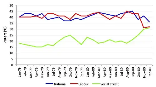 Rowling was already seriously considering resigning from politics altogether. After the 1978 election, it was clear that his days as leader were numbered and a leadership challenge was imminent. Earlier in 1980 Rowling sacked Roger Douglas from his shadow cabinet as consumer affairs and transport spokesperson for releasing an unauthorised alternative budget, fuelling prospects of a leadership challenge from Douglas' friend David Lange.[1] Many were also weary of the fact that Labour was still polling well below National and just barely ahead of the Social Credit Party, who reached their popularity zenith during the East Coast Bays by-election.[2]