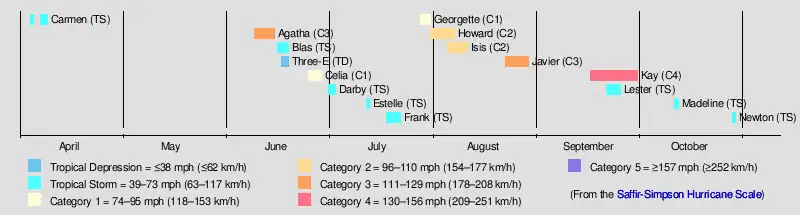 Overall, the 1980 season was slightly below the long-term average, with 16 tropical cyclones forming. Of those, 15 were named, 7 reached hurricane intensity, and only 3 became major hurricanes by attaining category 3 status or higher on the Saffir–Simpson scale.[3] All eastern Pacific systems this year formed in the eastern Pacific proper and two storms crossed into the central Pacific: Carmen from the west and Kay from the east.[4] The season had an early start when Carmen crossed over the International Date Line in April.[4] The strongest storm of this season is Hurricane Kay, peaking at 140 mph (225 km/h). Kay lasted for fourteen and a half days, which was the fifth-longest-lasting Pacific hurricane at the time.