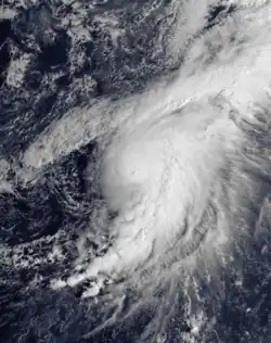 The interaction of an upper-level trough and a tropical wave spawned Tropical Storm Kate at 1800 UTC on November 15, while located northeast of Puerto Rico. Kate strengthened while moving westward and was upgraded to a hurricane about 24 hours later.[68] Early on November 19, the storm made landfall in Ciego de Ávila Province, Cuba with winds of 110 mph (175 km/h). It curved west-northwestward and weakened to a Category 1 hurricane before emerging into the Gulf of Mexico late on November 19. Kate turned northwestward and strengthened, peaking as a 120 mph (195 km/h) Category 3 hurricane on November 20.[69] However, it weakened to a Category 2 hurricane on November 21, several hours before making landfall near Mexico Beach, Florida. The storm quickly weakened inland and was downgraded to a tropical storm on the following day. It crossed the Southeastern United States and emerged into the Atlantic Ocean near Cape Fear, North Carolina on November 23. Kate re-curved east-southeastward, before becoming extratropical while located about halfway between the Outer Banks and Bermuda.[70]