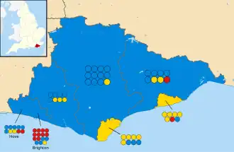 All 70 seats to East Sussex County Council 36 seats needed for a majority | |||||||||||||||||||||||||||||||||||||||||||||||