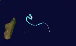 The first named storm of the season, Alibera formed on December 16, well to the northeast of Madagascar. For several days, it meandered southwestward while gradually intensifying. On December 20, Alibera intensified to tropical cyclone status with 10‑minute winds of 120 km/h (75 mph), or the equivalent of a minimal hurricane. That day, the Joint Typhoon Warning Center (JTWC), an unofficial warning agency for the region, estimated peak 1‑minute winds of 250 km/h (160 mph), while the Météo-France office in Réunion (MFR) estimated 10‑minute winds of only 140 km/h (87 mph). After drifting erratically for several days, the storm began a steady southwest motion on December 29 as a greatly weakened system. On January 1, Alibera struck southeastern Madagascar near Mananjary, having re-intensified to just below tropical cyclone status. It weakened over land but again restrengthened upon reaching open waters on January 3. The storm shifted directions while moving generally southward, dissipating on January 5.[2][9] It was the second longest-lasting tropical cyclone in the basin since the start of satellite imagery, with a duration of 22 days. Only Cyclone Georgette in 1968 lasted longer at 24 days.[10]