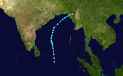 On December 14, the IMD reported that a depression had developed within the Intertropical Convergence Zone over the southern Bay of Bengal.[9] Over the next day the system moved north-westwards and gradually developed into a cyclonic storm, as the JTWC initiated advisories on the depression and assigned it the designation Tropical Cyclone 04B.[9][2] The system subsequently continued to intensify, as it recurved and moved through a break in the subtropical ridge of high pressure.[7][2] Late on December 16, the JTWC reported that the cyclone had peaked as a tropical storm, with 1-minute wind speeds of 85 km/h (55 mph).[12] Early on December 17, the IMD reported that the system had peaked as a Severe Cyclonic Storm with 3-minute wind speeds of 100 km/h (60 mph).[9] The system subsequently started to weaken later that day, as it encountered increasing upper-level wind shear associated with the mid-latitude westerlies.[2] During the next day the system weakened into a Cyclonic Storm, before it degenerated into a depression.[9] The system subsequently made landfall on Bangladesh near Cox's Bazar, before it was last noted over Myanmar by the JTWC during December 19.[9][12] The system caused some deaths and damages in both Bangladesh and Myanmar.[4]