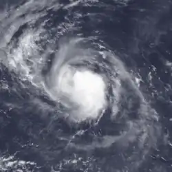 The system continued intensifying until reaching hurricane status at 00:00 UTC on January 30, and it reached major hurricane status on February 2, reaching maximum sustained winds of 115 mph (185 km/h).[7] However, unfavorable wind shear began taking a toll on the storm, causing it to rapidly weaken. Ekeka crossed the International Date Line as a weakened tropical storm, and shortly thereafter degraded to tropical depression status. Ekeka continued westward, passing through the Marshall Islands and later over Chuuk, before dissipating on February 9 about 310 mi (500 km) off the north coast of Papua New Guinea.[6]