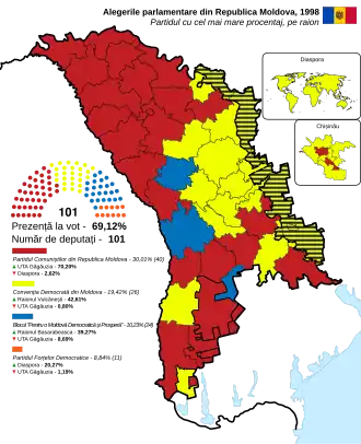 Parliamentary elections were held in Moldova on 22 March 1998.[1] The Party of Communists of the Republic of Moldova (PCRM) emerged as the largest party in Parliament, winning 40 of the 101 seats. However, the three other parties to win seats – the Democratic Convention of Moldova (26 seats), For a Democratic and Prosperous Moldova (24), and the Party of Democratic Forces (11) – formed a coalition government which was later known as the Alliance for Democracy and Reforms, pushing the Communists in opposition until the next elections in 2001.