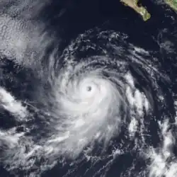 The depression tracked steadily northwestward, caused by its location along the western periphery of a subtropical ridge. It would retain that direction for most of its remaining duration. Late on August 11, it intensified into Tropical Storm Georgette, and two days later it attained hurricane status after developing a 40-mile (64 km) eye about 615 miles (990 km) south-southwest of Cabo San Lucas.[30] The eye became increasingly distinct while banding features became very well organized.[32] Georgette attained peak winds of 115 mph (185 km/h) while centered 690 miles (1,110 km) west-southwest of the southern tip of Baja California.[30] The hurricane soon moved over cooler water,[32] and began to weaken as convection warmed and decreased. On August 16, it degenerated into a tropical storm, and Georgette dissipated on August 17 without ever affecting land.[30]