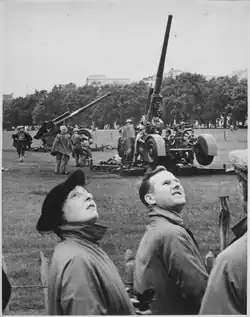 On 5 June 1940, after the British Army had been evacuated from Dunkirk and the Battle of Britain was about to start, the 1st AA Division comprised 45 4.5-inch, 39 3.7-inch and 26 3-inch HAA guns, with three 3-inch, 19 Bofors, three twin Vickers and 185 LMGs in the LAA role, together with 240 90 cm searchlights.[19] On 11 July, the division's guns were disposed with 92 defending London, 28 at Slough, 4 at Hounslow, 4 at Stanmore, and 34 others dispersed to VPs.[20]