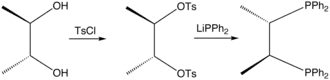 Chiraphos is prepared from S,S or R,R-2,3-butanediol, which are derived from commercially available S,S or R,R-tartaric acid; the technique of using cheaply available enantiopure starting materials is known as chiral pool synthesis. The diol is tosylated and then the ditosylate is treated with lithium diphenylphosphide.[1] The ligand was an important demonstration of how the conformation of the chelate ring can affect asymmetric induction by a metal catalyst. Prior to this work, in most chiral phosphines, e.g., DIPAMP, phosphorus was the stereogenic center.