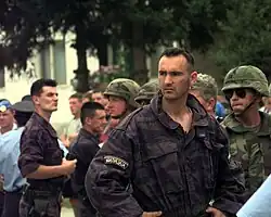 Republic of Srpska Special Police and soldiers from the 3rd Squadron, 3rd Armored Cavalry Regiment provide security in downtown Bratunac as local residents jeer at buses carrying the Women of Srebrenica to a memorial ceremony in Potocari during Operation Gallant Vigil, on July 11, 2000.