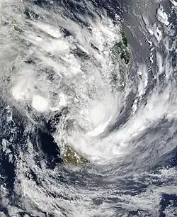 Early in its duration, Gerry passed just west of Tromelin Island, producing tropical storm force winds and gusts to 111 km/h (69 mph). The cyclone originally threatened to strike Mauritius directly, but due to a more east-south-easterly motion, Gerry passed more to the east.[31] The storm forced the closure of Sir Seewoosagur Ramgoolam International Airport,[32] along with schools and government offices.[33] Wind gusts on Mauritius reached 144 km/h (89 mph). Gerry dropped heavy rainfall, peaking at 139.2 mm (5.48 in) at Mare aux Vacoas, and it produced high waves along the northern coast. One person was killed who was electrocuted during the storm's passage.[31]