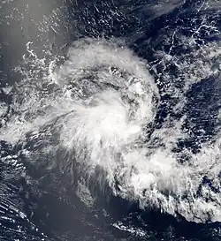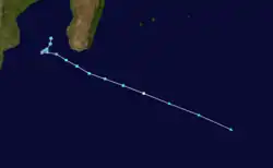 In late August, a weak low-level circulation persisted near Diego Garcia. It was associated with a trough near the equator, and initially remained disorganized due to high wind shear. The disturbance was located at a low latitude near the equator, and a ridge extending from the eastern coast of Africa imparted a general west-south-west movement.[8] The system was organized enough to be classified by MFR on September 5 at 3.1° S.[9] Subsequently, the system developed more convection as its circulation became better defined. Operationally, MFR began issuing warnings on September 5 on Tropical Disturbance 01, and the next day upgraded it to a tropical depression.[8] Post analysis from MFR indicated that the system reached peak winds of 65 km/h (40 mph) on September 6,[9] the same day that the Joint Typhoon Warning Center (JTWC) initiated advisories on it as Tropical Cyclone 01S. The storm developed banding features, but the thunderstorms were sheared away from the circulation. On September 7, the storm moved through Seychelles—an island nation in the southern Indian Ocean—before weakening. MFR discontinued advisories on September 8, and the JTWC followed suit the next day.[8]