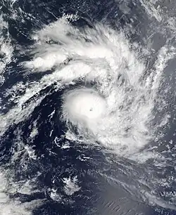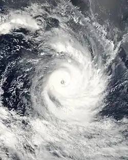 Around the same time that Tropical Storm Gerry was developing, another area of convection to its east was organizing.[31] On February 7, the system became a tropical disturbance, and initially moved to the north.[34] Operationally, MFR first began issuing advisories on February 9 for Tropical Disturbance 11, when the system had a small center and accompanying convection. By that time, the disturbance had turned to the south, and favorable conditions allowed for gradual development.[31] MFR upgraded the system to tropical storm status late on February 9,[34] although the system was not named Hape until 36 hours later. On February 10, the JTWC initiated advisories on Tropical Cyclone 17S. An eye developed on February 11, suggesting quick intensification.[31] At 1800 UTC that day, the JTWC and MFR upgraded Hape to the equivalent of a minimal hurricane and to tropical cyclone status, respectively.[34] By that time, the cyclone had turned to the east-north-east due to a weakness in a ridge to the north.[31] MFR estimated that Hape reached peak 10-minute winds of 150 km/h (93 mph) on February 12, and the next day the JTWC estimated 1-minute winds of 165 km/h (103 mph). Later, the storm weakened, and it turned to the south-east when the ridge re-intensified. Outflow decreased due to interaction with Cyclone Gerry to the west,[31] and Hape weakened to tropical storm status on February 13.[34] On February 15, the JTWC discontinued advisories once the circulation was exposed from the deep convection. The next day, MFR followed suit after the circulation dissipated.[31]