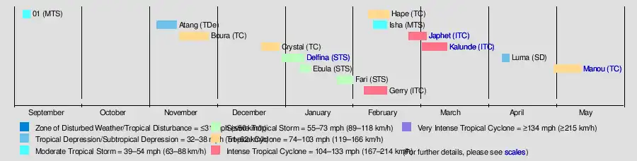 During the season, MFR issued advisories on 16 systems, of which 13 intensified to reach tropical storm force winds, meaning conditions were generally favorable for tropical cyclogenesis. The 13 systems with tropical storm force winds is only one short of the most such storms since the beginning of satellite-tracking in the 1967–68 season,[4] set in the 1993–94 season.[5] This is four more than the average of nine named storms.[6] In this season, there were 24 days on which tropical cyclones were active, slightly above normal, but only one storm—Kalunde—remained at that intensity for more than three days. By contrast, there were 68 days in which a tropical storm was active in the basin, which is 15 days above normal. The season began early and ended late; only four seasons began earlier and four ended later than this season since the start of satellite-coverage in the basin.[4]